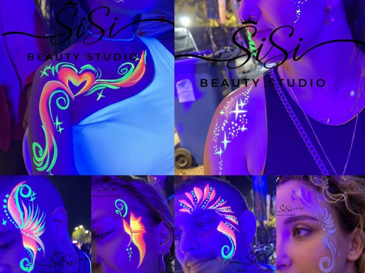 עמדת ציורי פנים וגוף זוהרים מתאים לכל אירוע וגם לילדים כולל תאורת עמדה בלבד